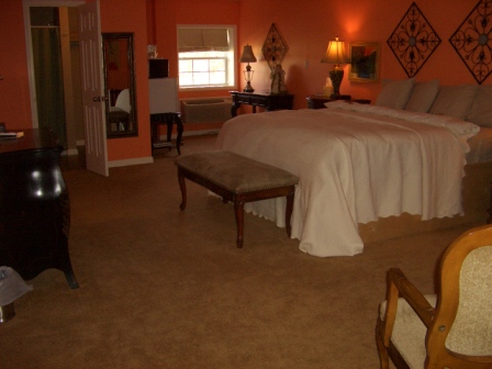 Cowboy King draws you in like a warm fire. Its warm color and spacious room size offers the delighted guest warmth and charm along with designer vessel vanity.